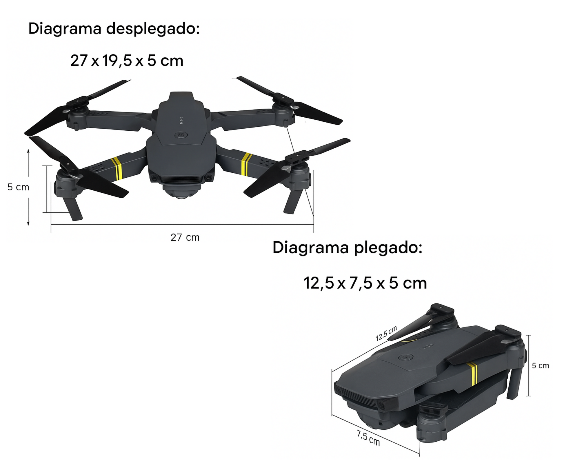 Dron desplegado: 27 × 19,5 × 5 cm